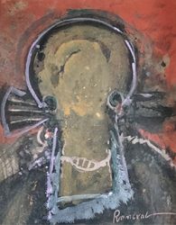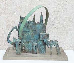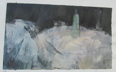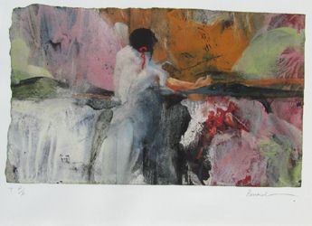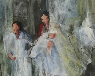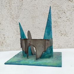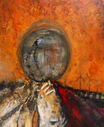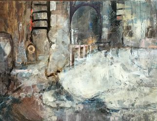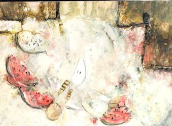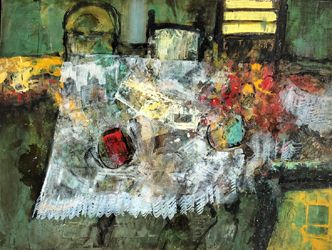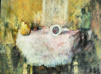 Mesa en rosa y al fondo una luz amarilla Óleo